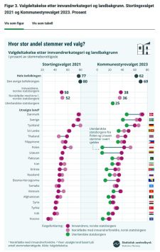 Det er store forskjeller avhengig av landbakgrunn. I figuren fra SSB ser vi blant annet at utenlandske statsborgere fra Polen og Litauen stemmer svært sjelden.